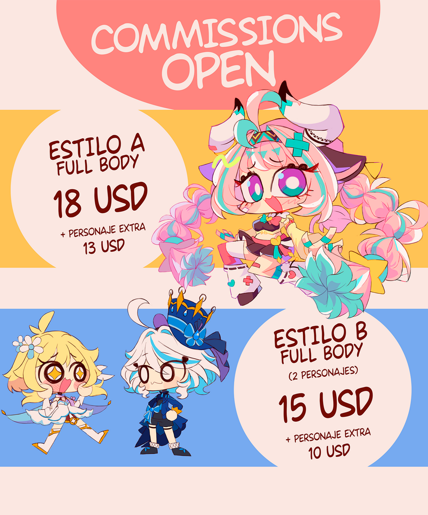 Si estás de acuerdo con mis TÉRMINOS Y CONDICIONES, envíame un mensaje a mi correo "[email protected]" o un mensaje privado a mi cuenta de Instagram con la siguiente información para tu comisión:🌿 Tipo de comisión // Cantidad de personaje // Expresión y pose // Referencias del personajeTrabajo con fondo simple, si deseas un fondo más detallado, podemos hablarlo por interno.